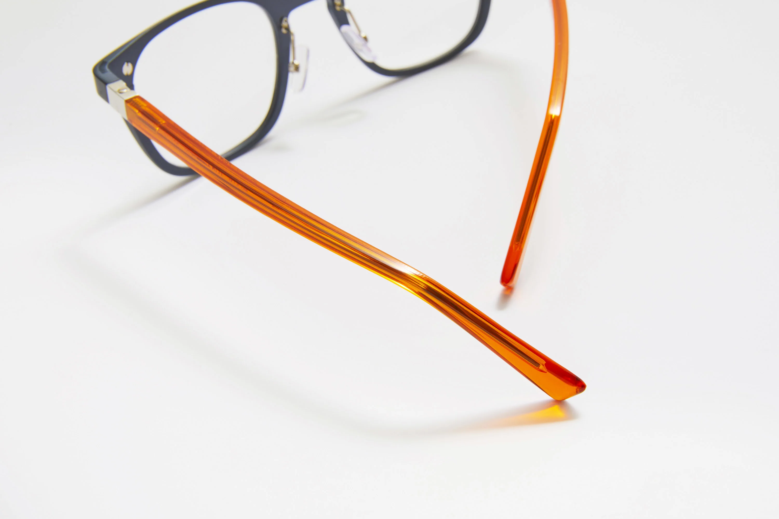 This new concept features elegant colours that illuminate the gaze like an emerald blue, an urban burgundy, or a forest green. New warm harmonies adorn it, like this velvet navy blue with a mustard touch on the temple; or this striking steel grey coupled with its’ crystal orange temple.
