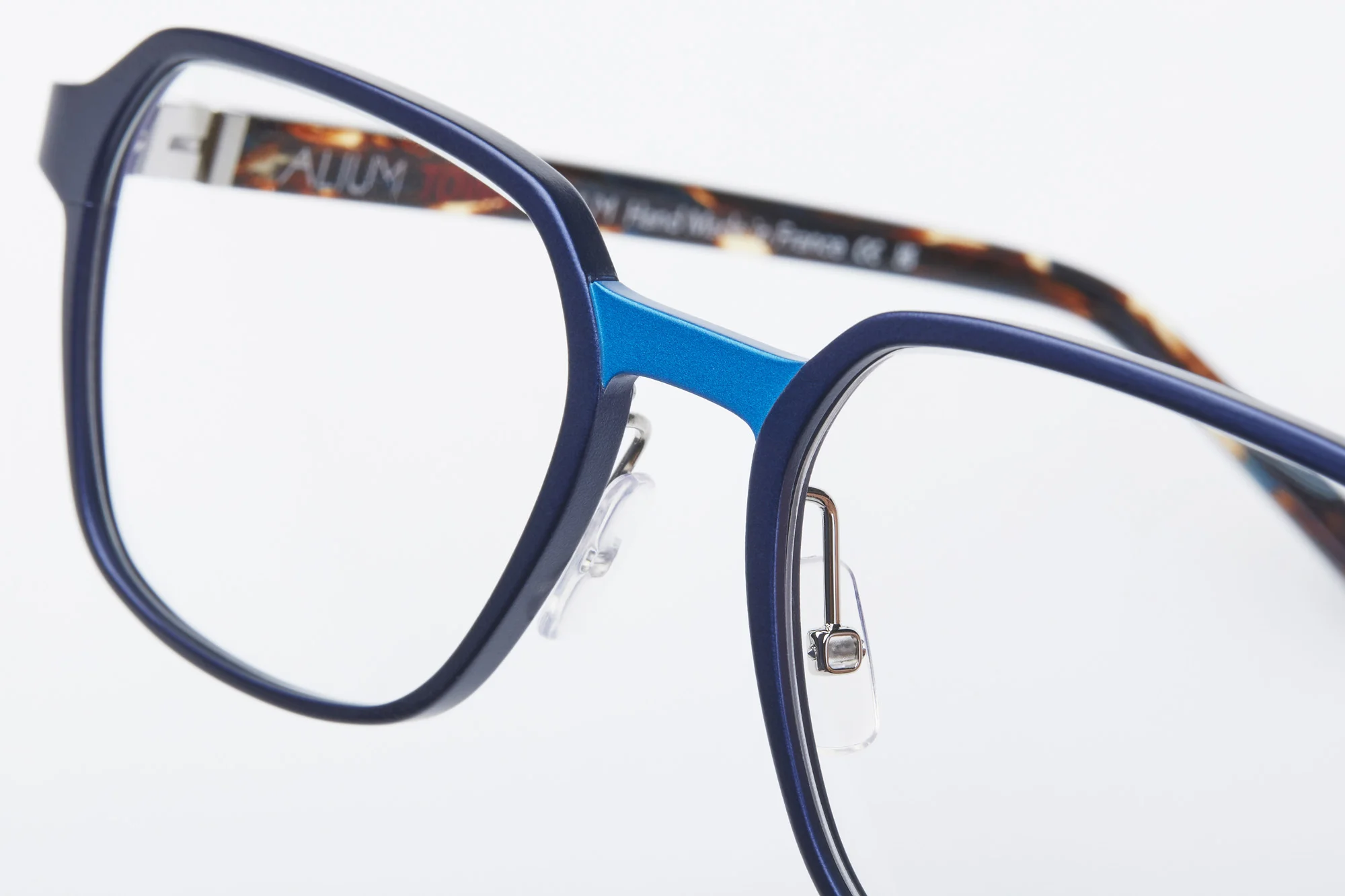 This design is made in France with a classic hinge – the ALIUM brand signature. The bridge has a milled recess to better highlight the colour. Finally, we achieved the endpiece milling with an ALIUM-patented technique.
